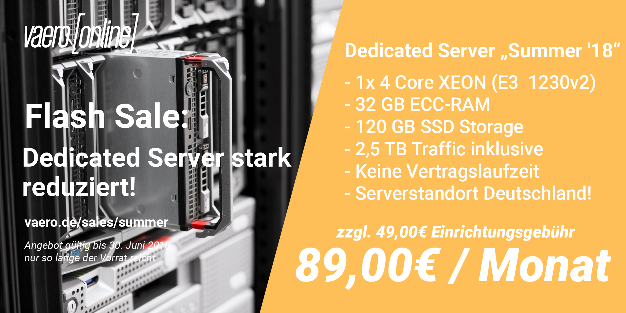 Der vaero [online] Summer Sale 2018 läuft nur noch bis zum 30. Juni, also kaum mehr 9 Tage. Zum Endspurt haben wir uns noch einmal ein besonders Angebot für euch überlegt: [Ein Dedicated Server, basierend auf Enterprise Hardware, mit 32GB ECC-DDR3 RAM und einem QuadCore Intel XEON CPU für 89€ im Monat..]((https://vaero.de/sales/summer) Weitere Details auf der Produktseite Im Vergleich zu unserem kleinsten DedicatedServer Modell aus dem normalen Angebot spart ihr mit unserer Summer Sale Sonderedition also schonmal mehr als 60 Euro / Monat! Wenn ihr also schon immer eine eigene, dedizierte Serverumgebung für eure Projekte haben wolltet, dann ist jetzt der richtige Zeitpunkt zum Zugreifen!